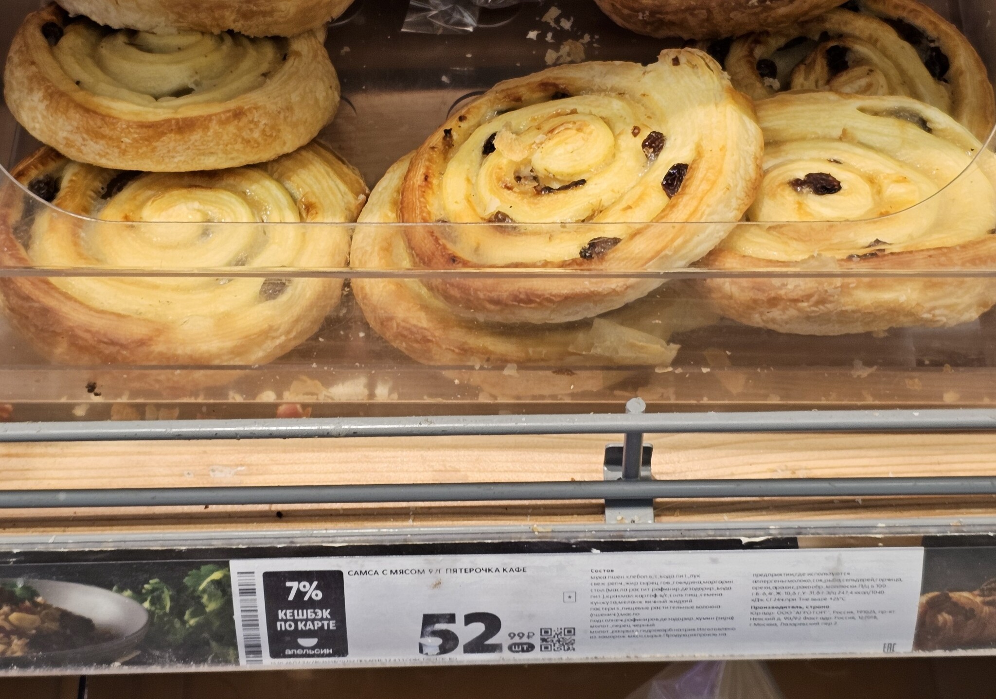 Захожу тут в Пятерочку, смотрите какая сладкая булочка с изюмом. А что под ней? "Самса с мясом" за 52 рубля. А рядом еще куча выпечки вообще без цен.