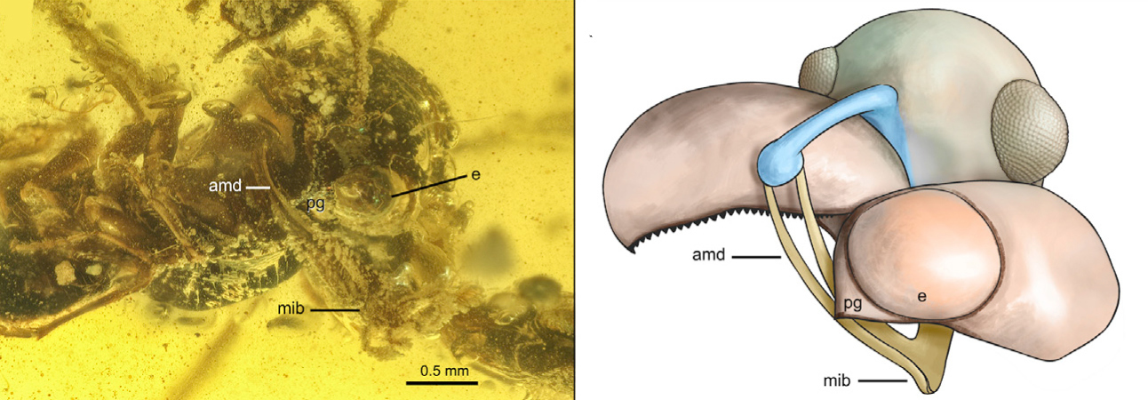 Смертельная хватка адского муравья Ceratomyrmex ellenbergeri, зажавшего алиеноптеру Caputoraptor elegans. Условные обозначения: amd — передние концы челюстей муравья, e — глаз алиеноптеры, mib — медиовентральная (срединно-брюшная) лопасть челюсти муравья, pg — заглазничная часть головной капсулы алиеноптеры (гена; см. gena). Изображение из статьи P. Barden et al., 2020. Specialized predation drives aberrant morphological integration and diversity in the earliest ants