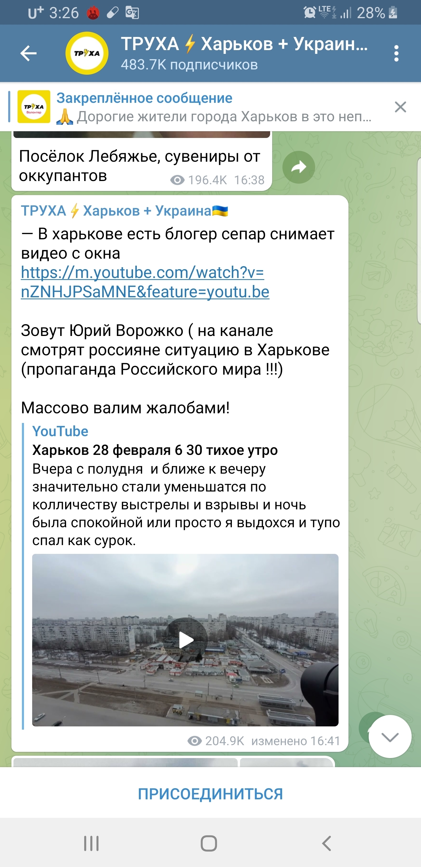 Есть один человек, в Харькове, зовут его Юрий Ворожко. Он имеет скромный ютуб-канал, где выкладывает обычные видео о своей жизни. Не блогер, нет, просто видео со скромными парой тысяч просмотров, для себя. Начались всем известные события и внезапно его видео о жизни в "военном" Харькове начали собирать просмотры. За пару дней число подписчиков выросло до 200к, а просмотры к нескольким миллионом. Видео максимально нейтральные, как продукты, где вода и тому подобное, на пару минут всего. Добрые я бы даже сказал видео. И тут внезапно он говорит что вынужден покинуть дом и скрываться у друзей. Его назначили сепаратистом. Знаете, я и так принимаю всё это близко к сердцу (да собственно как и любой другой человек), но это потрясло. Скорее бы это уже всё закончилось