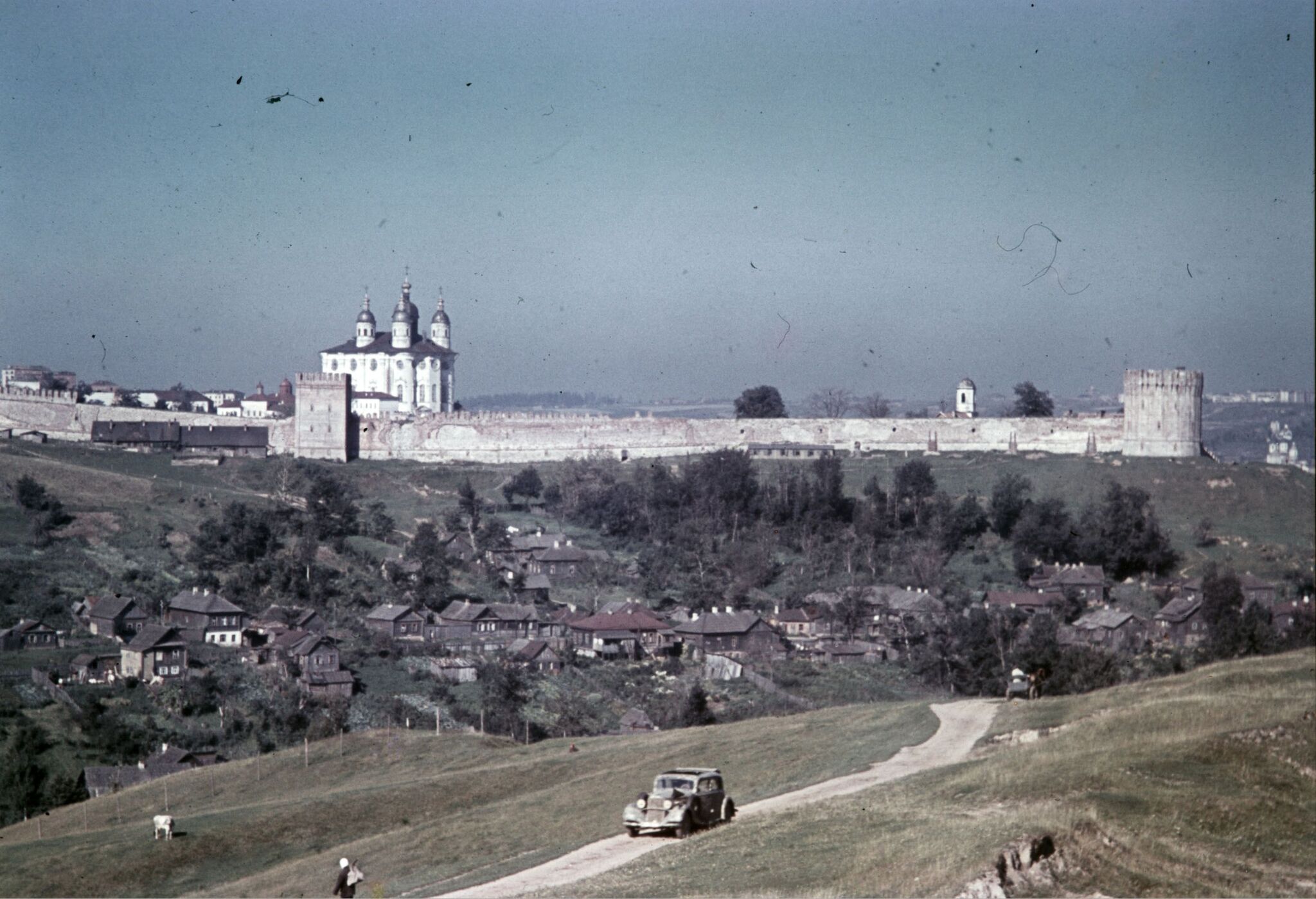 Панорамный вид на Успенский собор и крепостную стену с башнями «Поздняков» и «Веселуха» в оккупированном Смоленске.