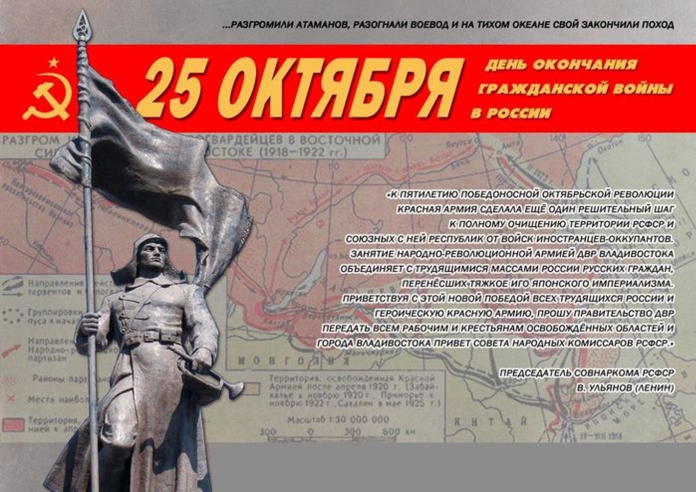 Приветствуя с этой новой победой всех трудящихся России и героическую Красную Армию, прошу правительство ДВР передать всем рабочим и крестьянам освобожденных областей и города Владивостока привет Совета Народных Комиссаров РСФСР».
