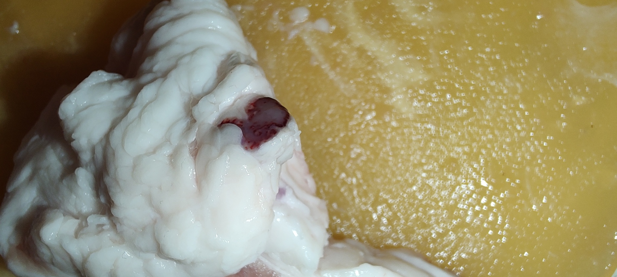 Купил в Пятёрочке окорок охлаждённый от производителя Слово мясника. И при разделке вот с такой фигнёй столкнулся впервые за свои 53 года. По виду напоминает разрезанного червя. Находится в сале сбоку куска. Дальше препарировать не стал, так стало просто противно. Кто подскажет, что это такое? Можно ли такое мясо есть?
