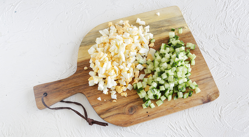Яйца для окрошки сварите вкрутую (10 минут). Охладите проточной водой, затем очистите и нарежьте кубиками. Свежие огурцы вымойте, обсушите и нарежьте кубиками.