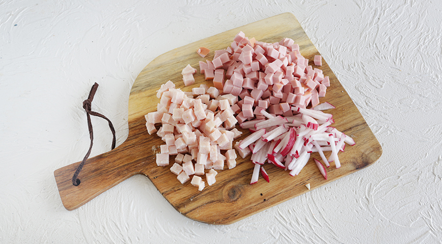 Редис вымойте. Нарежьте тонкой соломкой. Вареную колбасу и ветчину нарежьте кружочками толщиной 5 мм, затем маленькими кубиками. Картофель очистите и нарежьте кубиками.
