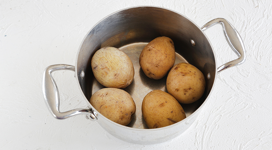 Подготовьте ингредиенты для окрошки. Картофель вымойте с помощью щетки и сложите в кастрюлю. Залейте горячей водой и доведите до кипения. Варите 30 минут. Дайте полностью остыть.