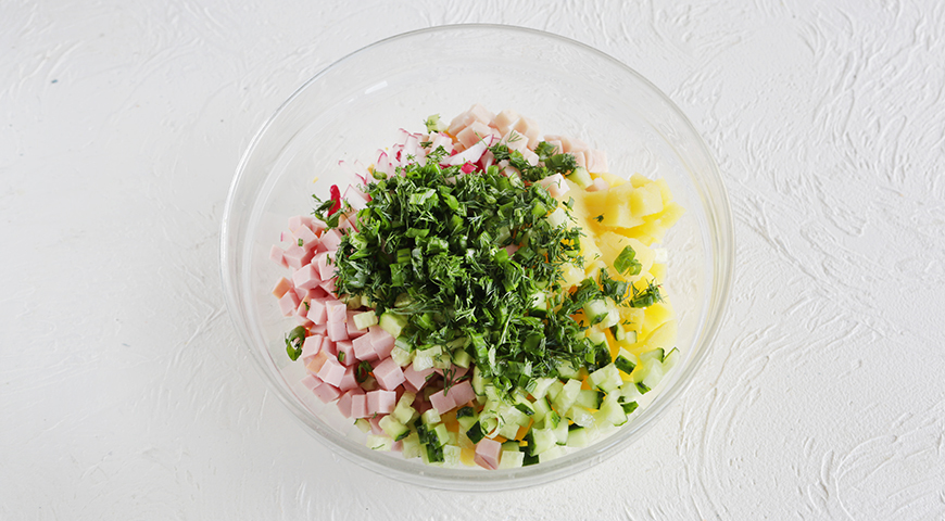 Зеленый лук и укроп для окрошки вымойте и обсушите бумажными полотенцами. Мелко нарежьте, затем сложите в большую миску. Добавьте редис, свежие огурцы, картофель, вареную ветчину, колбасу и яйца.