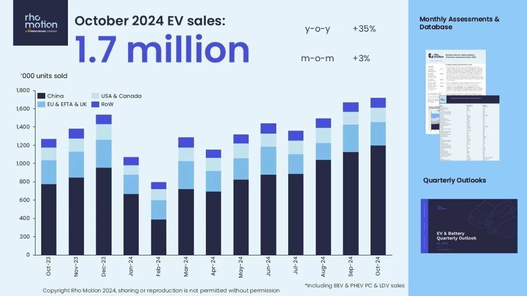 Rho Motion, ведущая исследовательская компания в сфере электромобилей, сегодня сообщила, что за октябрь было продано более 1,7 миллиона электромобилей, что на 50 000 превышает предыдущий рекорд, установленный в сентябре.