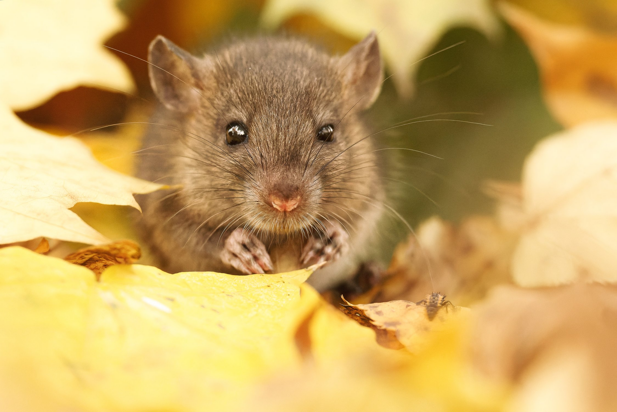 Маленький крысёнок среди желтой опавшей листвы изучает мир. Справа от него притаилась личинка божьей коровки. Москва, 2025.
