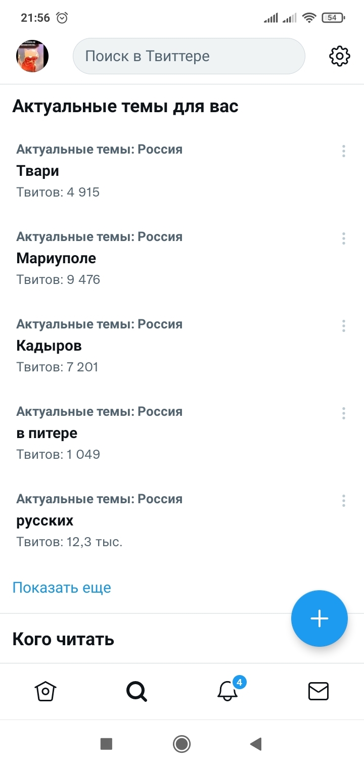 Asgylannon Окунулся 3 года назад Залез я твитер и увидел актуальную тему для себя. И название красивое "Твари". Подскажите, в твитере можно писать всё что угодно? Там трупы и пожелание смерти в обе стороны. Что за...? И зачем мне это пихают о.о X (Twitter) Политика Война Длиннопост Ещё 0
