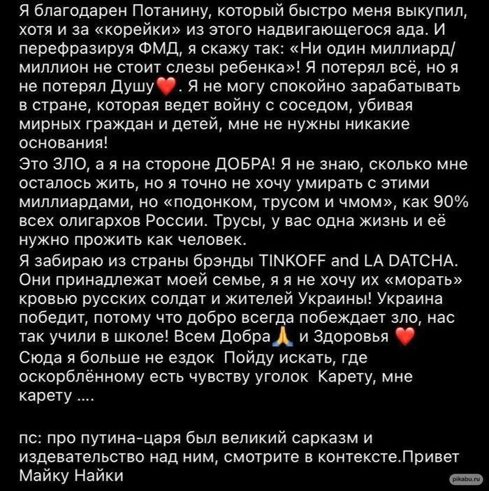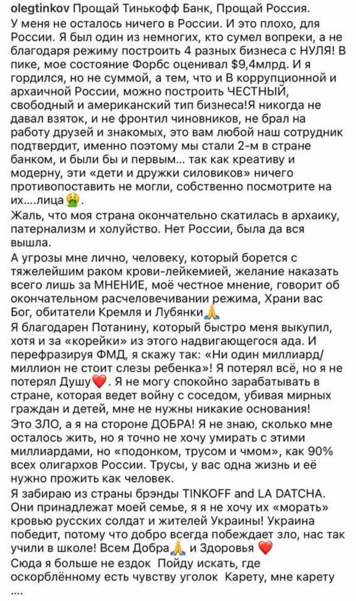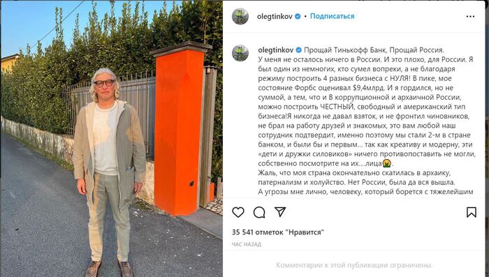 Скриншот с официального инстаграмм аккаунта Олега Тинькова, что подтверждается галкой верификации. Пруф: https://www.instagram.com/olegtinkov/ upd: Добавлен скрин с PS.