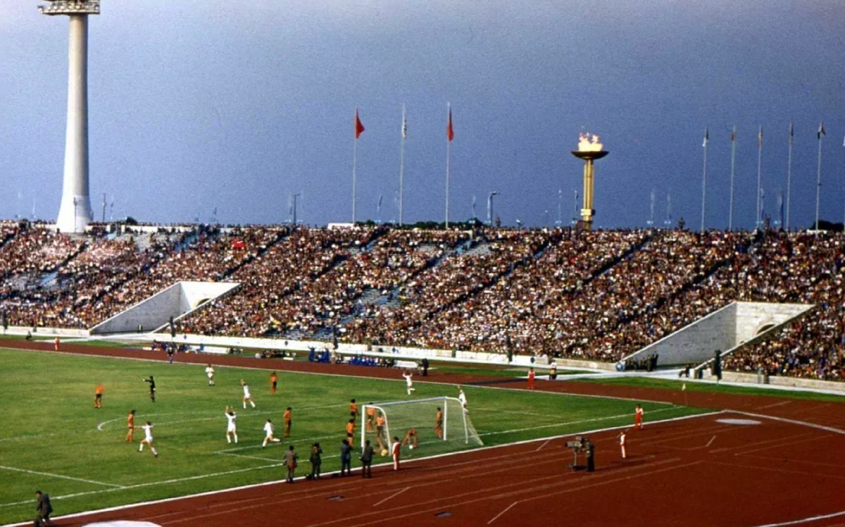 Футбольный матч на стадионе имени С.М. Кирова: Будущий олимпийский чемпион по футболу Олимпиады-80 команда ЧССР забивает первый гол в ворота сборной Колумбии. Матч закончился со счетом 3:0. 1980 г.