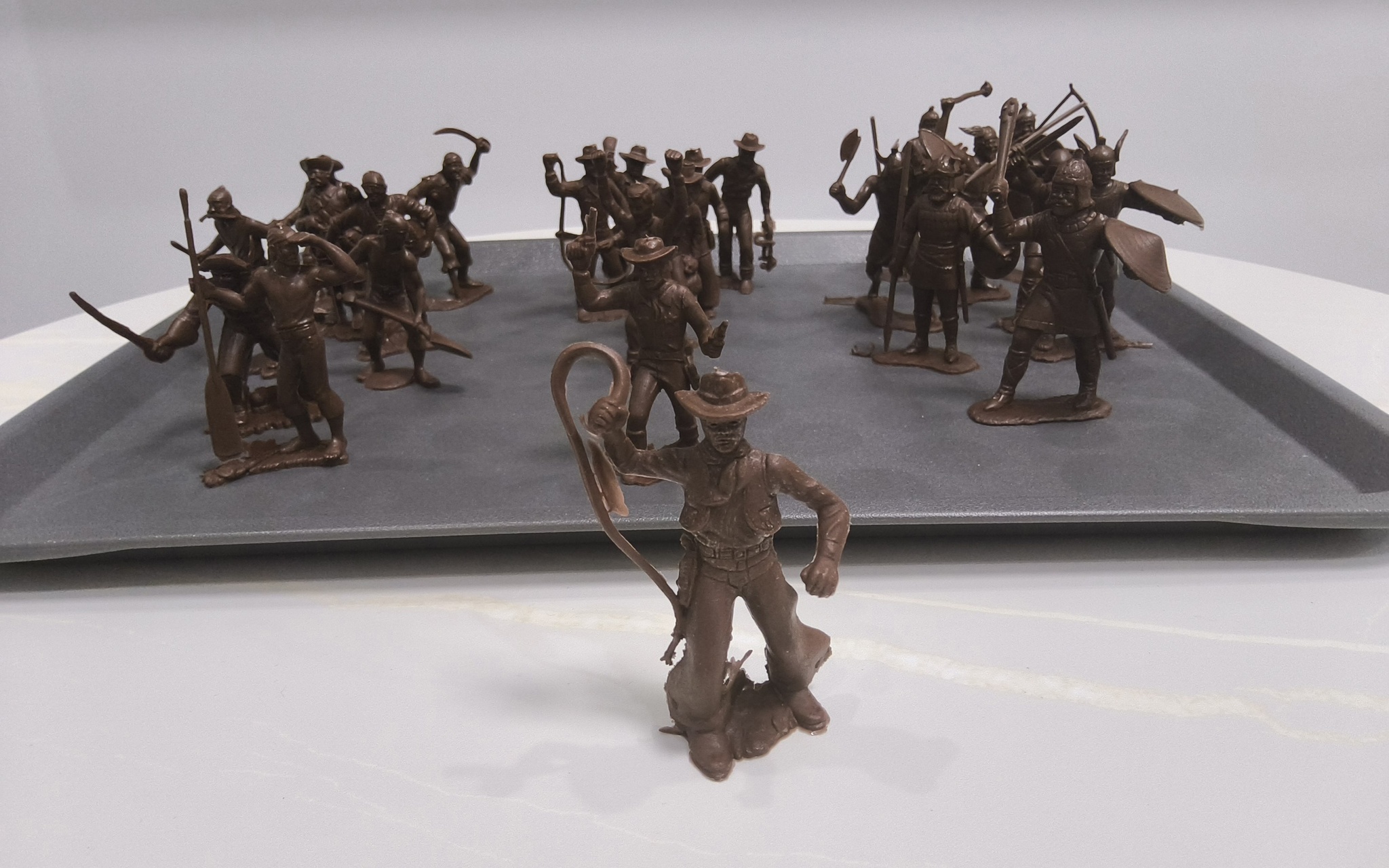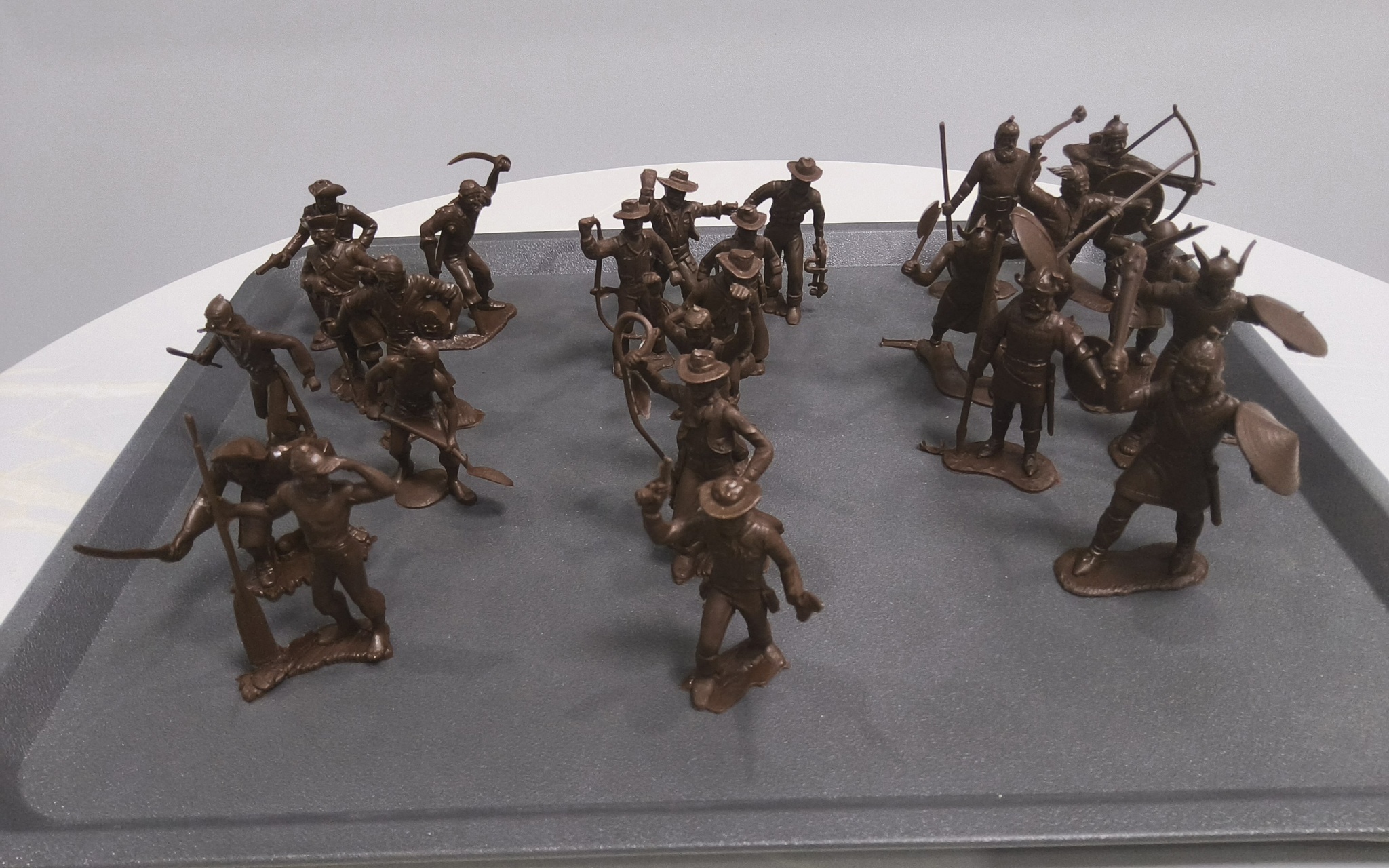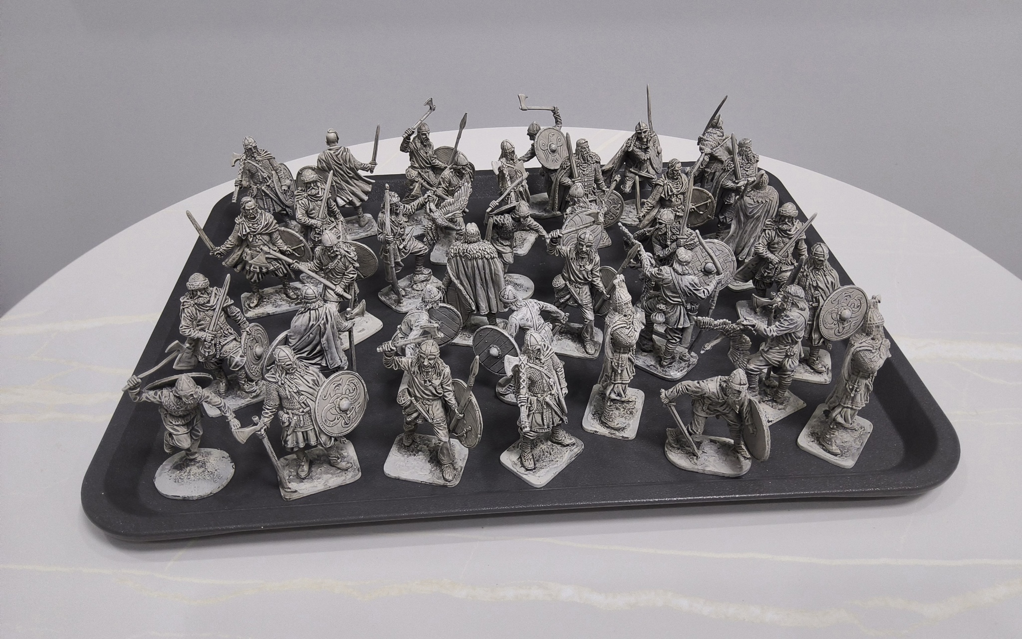 Я подумал, и решил, что все эти фигурки заслуживают нормальных больших круглых подставок - их, к тому же, можно будет красиво оформить. Подставки уже едут в студию - как доедут, пристроим каждого. Всякие викинги будут стоять на круглых 50 мм, а неандертальцы - на овальных 90х52 мм