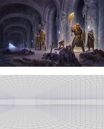 Тоже не понял, в чём необычность. Обычные линии построения любой картины, претендующей на реалистичность. Точки схода на линии горизонта, прямолинейные объекты...