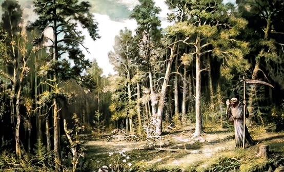 Я бы убрала это нечто рыжее и смерть с косой, оставила только прекрасный пейзаж и смерть, притаившуюся под кустом. Она в глаза сразу не бросается, думаю, удивила бы зрителя. А так, очень технично и красиво, конечно.