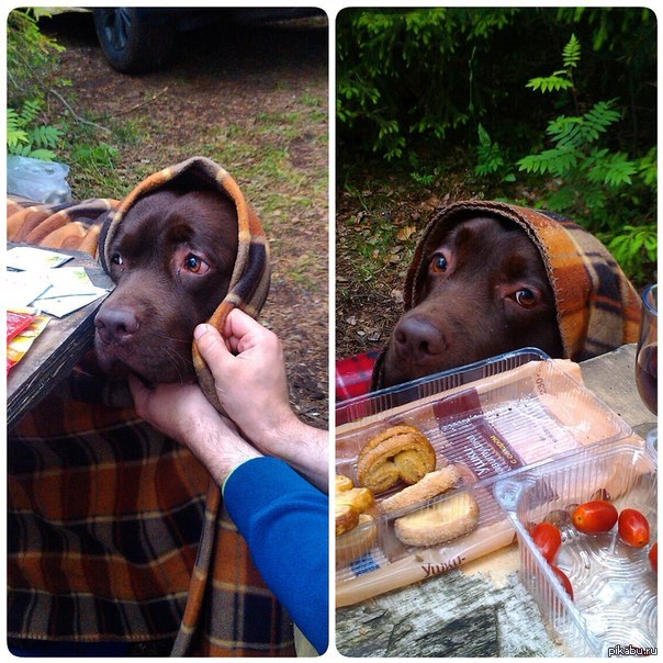 1104 Cauda Он мерз и его кусали комары) 11 лет назад в выходные ездили на природу, а у друзей вот такой вечно голодный, замечательный пес. Было холодно и много комаров, пришлось нарядить парня. [моё] Собака Лабрадор Шоколад