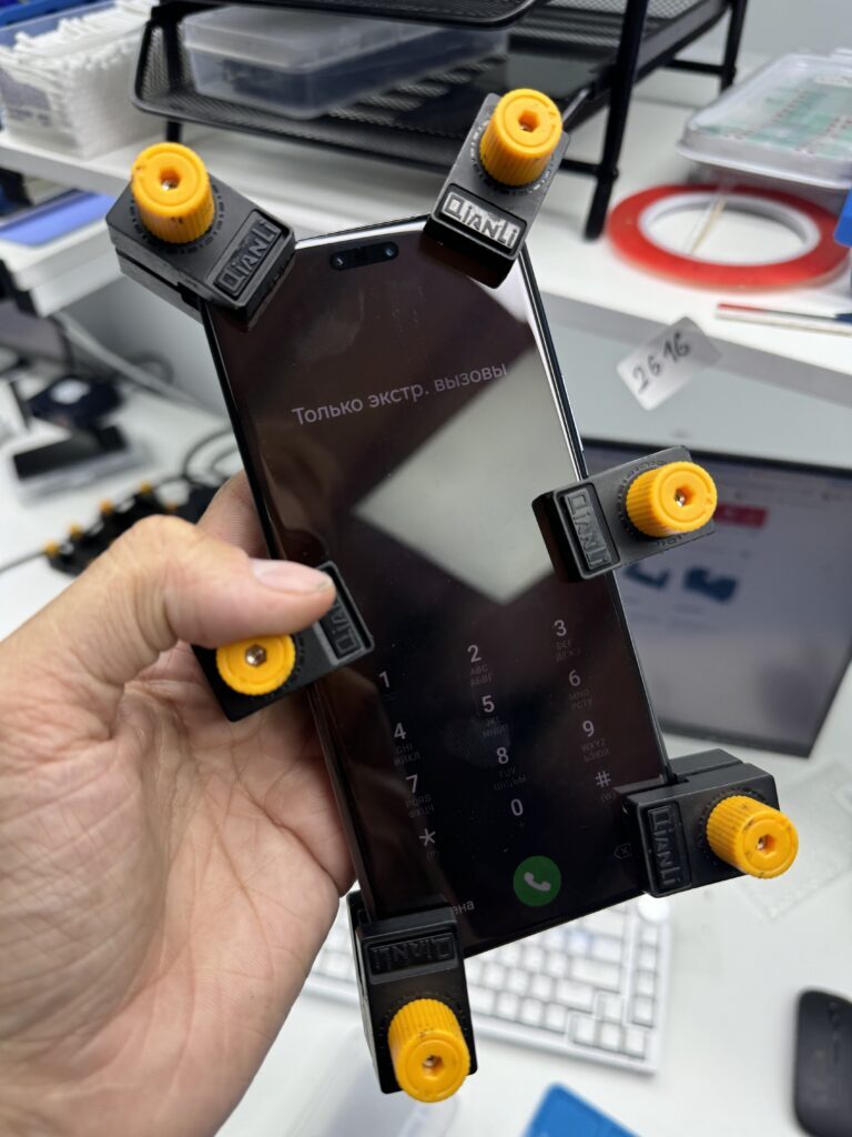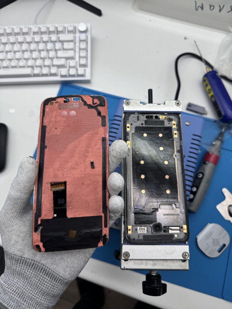 Кладем телефон на 100 градусный сепаратор и с помощью тонкой пленки и изопропилового спирта отделяем проклейку с герметиком от корпуса.