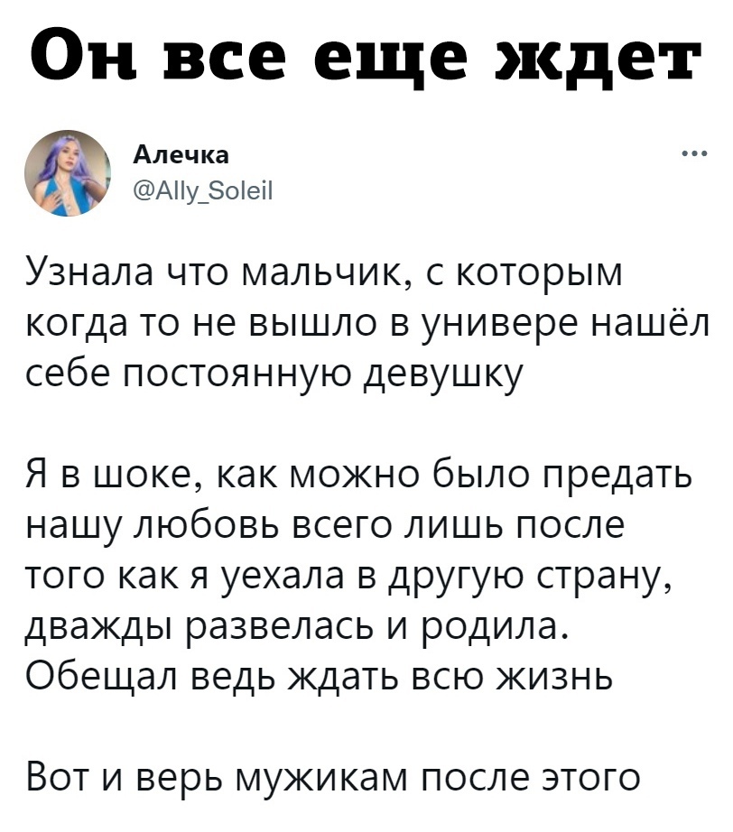 4368 vsoobsetve Он всё ещё ждёт6 3 года назад Источник https://vk.cc/cj3iMv Юмор Картинка с текстом Скриншот Ждун X (Twitter) Отношения Сарказм 70 13 5 5 Ещё 0