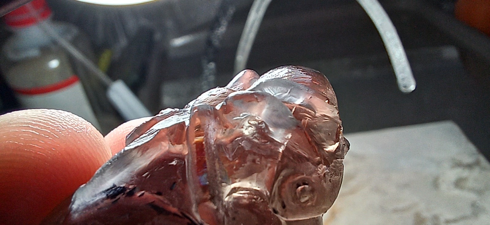 Собственно, о сложностях. В миниатюре велики риски отлома тонких частей, и чем тоньше эта часть, тем выше шанс, что где-то что-то отлетит от вибрации. Потому здесь, уже на этапе обработки лапок, я перехожу на мельчайшие боры с абразивностью в 2000 грит.