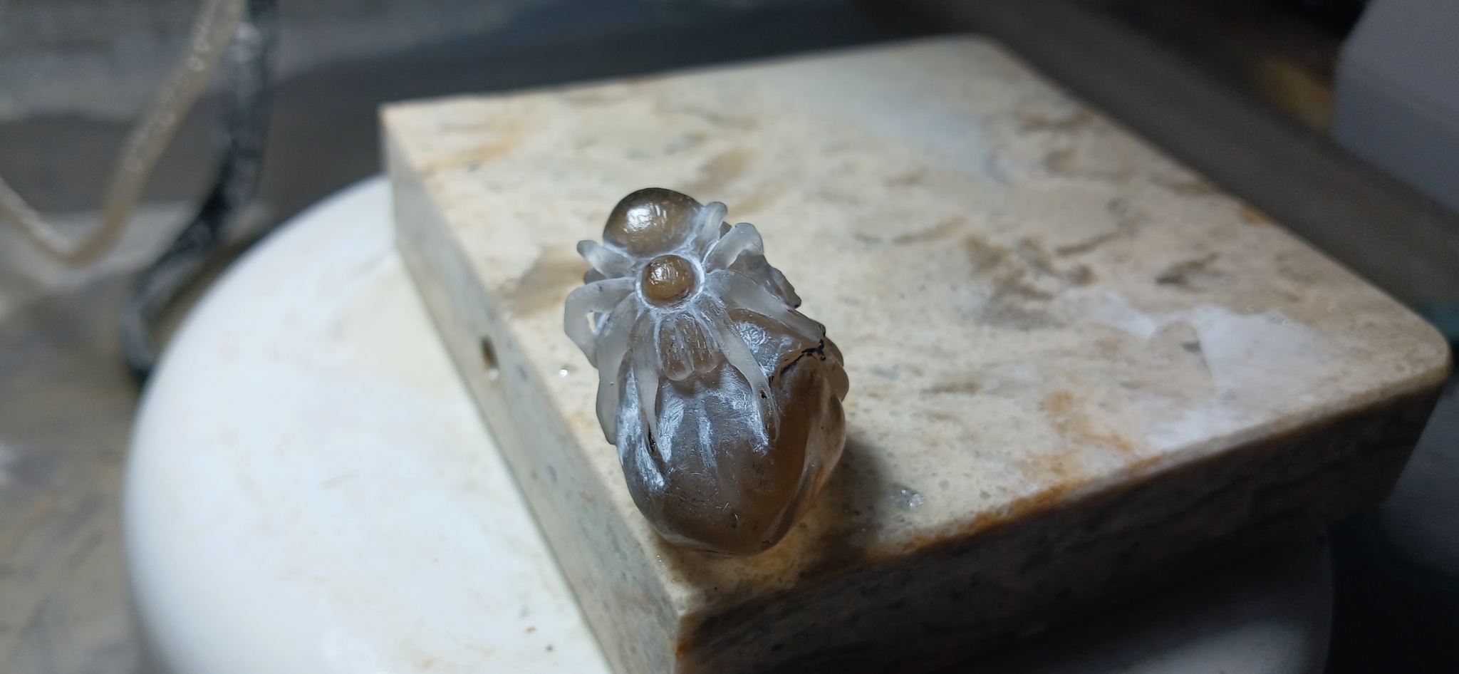 Несмотря на его сложность (а уже на этапе просветки были замечены внутренние недостатки, которые впоследствии пришлось бы обходить), он подходил больше всего. Площадка спила, на котором он располагается, верхняя форма камня, определили положение паука. И когда всё взвешено, продумано в голове, можно приступать к работе.