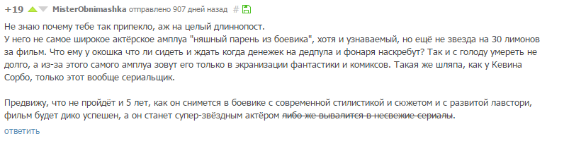 19 andt Он знал! Про Райана Рейнольдса почти 3 года назад 10 лет назад Ссылка на коммент #comment_14265704 Райан Рейнольдс Дэдпул Актеры и актрисы