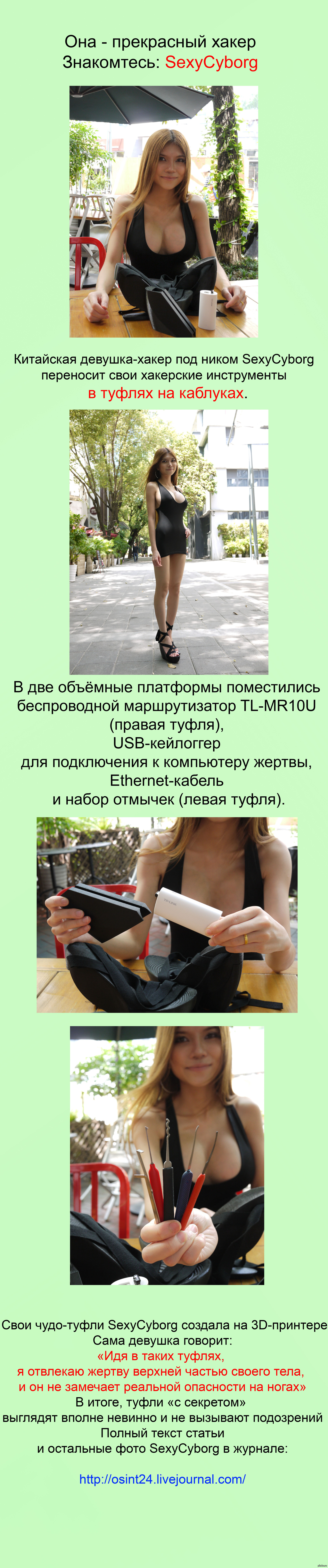 cyberagent007 10 лет назад Она - прекрасный хакер, знакомьтесь: SexyCyborg! Реально Sexy, а с такими туфлями еще и реально Cyborg! Хакеры Sexycyborg 3D принтер Девушки Блондинка Пентест Длиннопост
