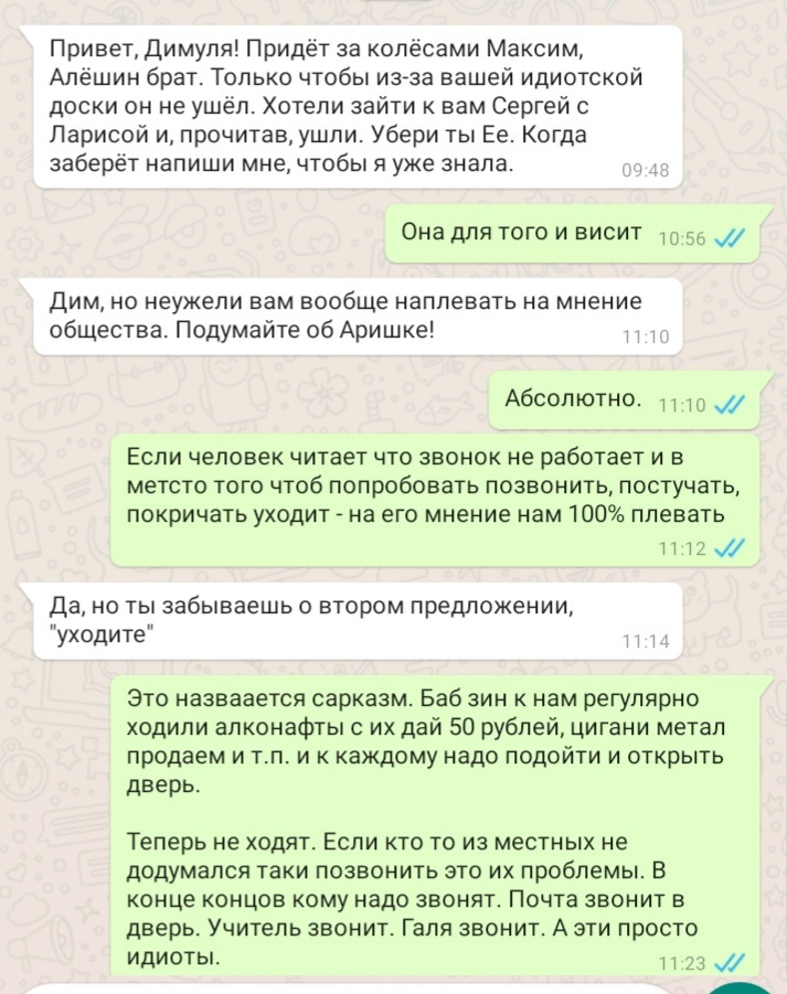 Почтальон (если ему надо), школьный учитель (ребенок учится на дому), соседи (те с кем общаемся) на табличку хихикают и до нас как то дозваниваются.