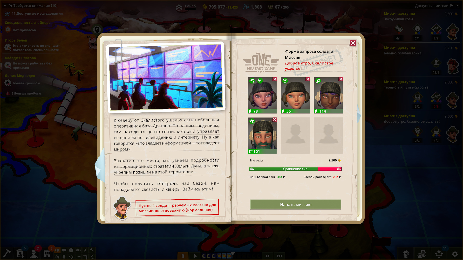А потом солдаты отправляются на миссии. Там ничего сложного: выбираете подходящих кандидатов и они улетают выполнять задачу. А вы получаете текстовые сообщения. Иногда придётся делать выбор.