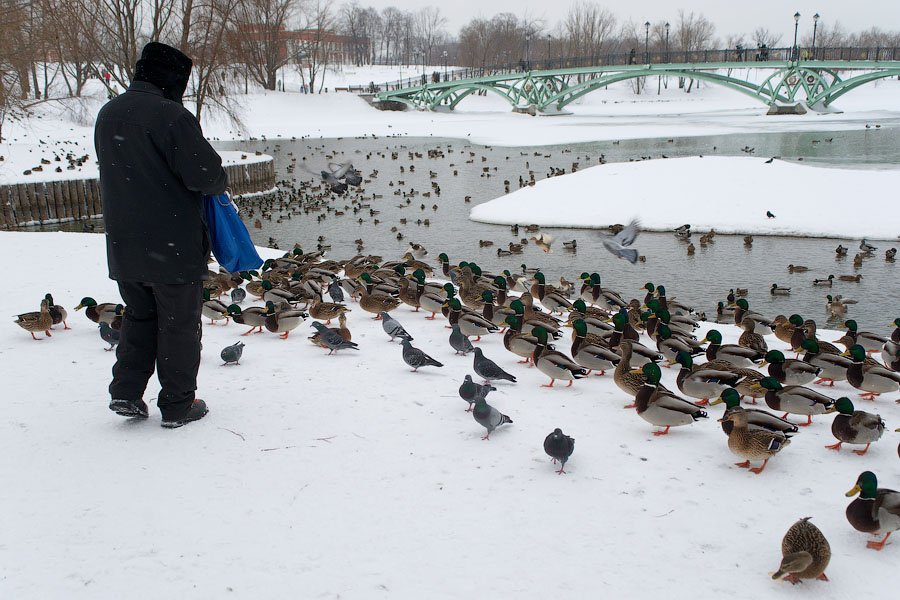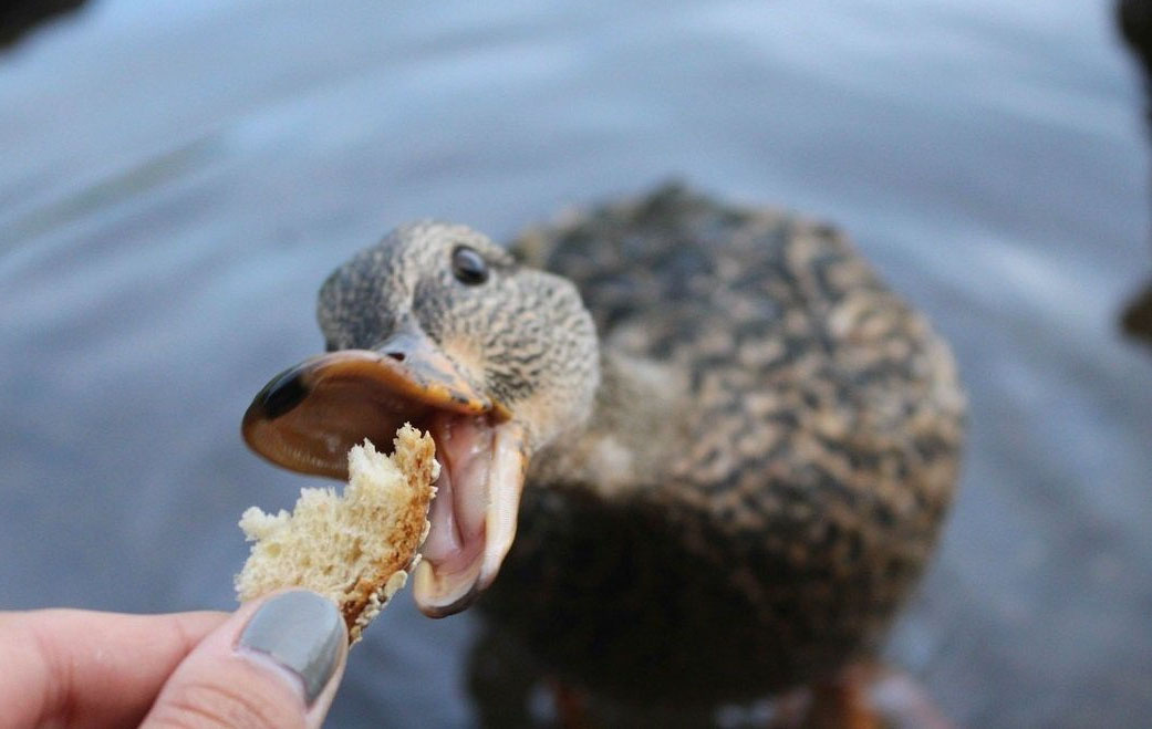 Природную осторожность как рукой сняло: теперь утки готовы выпрыгивать из воды, чтобы успеть выхватить кусок батона из рук прохожих быстрее своих сородичей.