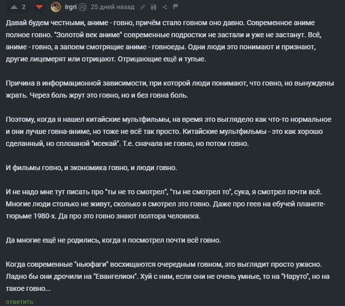 Вас не задолбали "исекаи" и повторение одних и тех же шаблонов, которые были 20 и 30 лет назад? Унижение мужчин, сплошная пропаганда, даже красивых девушек в аниме почти не осталось. Вы что, идиоты?