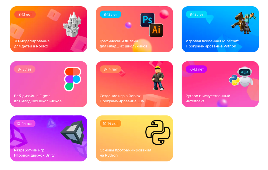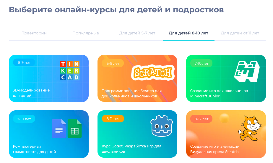 Онлайн-занятия для детей разных лет могут быть основаны на написании кода, графическом дизайне, создании игр и сайтов, трехмерном моделировании, компьютерной грамотности и альтернативных направлениях. Важнее другое: выбор конкретного варианта должен быть основан именно на возрастных особенностях, скажем, образовательных способностях и познавательных потребностях конкретного ребенка.