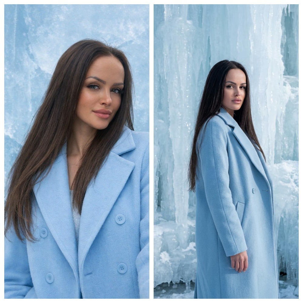 Создай изображение: Человек в голубом пальто холодного оттенка, стоит на фоне ледяной стены, минималистичный стиль, холодная цветовая палитра с оттенками glacier blue, ice blue и powder blue, естественное освещение, чистая композиция, fashion photography, высокое качество, 8k, профессиональная фотография. Пропорция 9:16