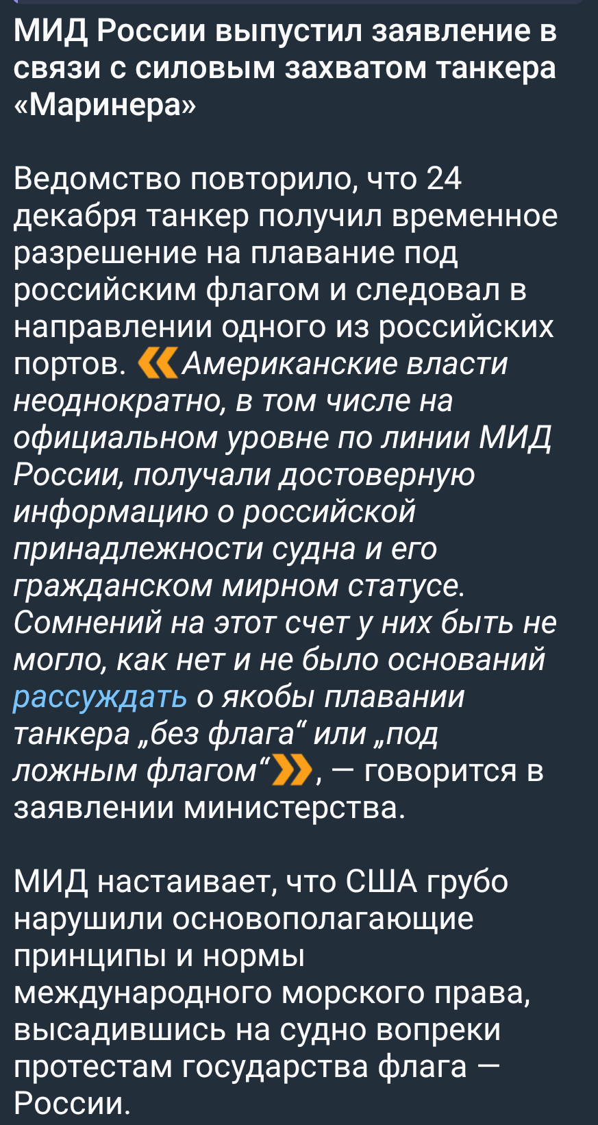 Судно «Маринера», получившее 24 декабря в соответствии с нормами международного права и российского законодательства временное разрешение на плавание под государственным флагом Российской Федерации,