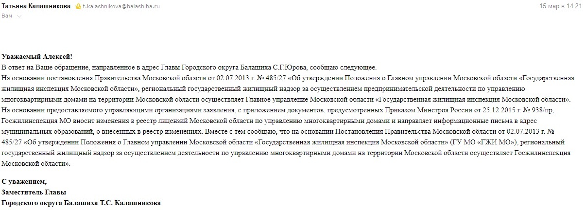 Помимо разумеещихся обращений в компетентные органы было отправлено письмо-обращение на эл. почту главы го Балашиха Юрову Сергею Геннадиевичу. Обычно, как вы сами понимаете, от таких лиц ответа не дождаться или же его приходится ждать все 30 дней, положенные по закону. Но здесь глава го Балашиха был, на удивление, очень оперативен, ответ на обращение пришел уже на следующей день, правда от заместителя главы го Калашниковой Татьяны Сергеевны