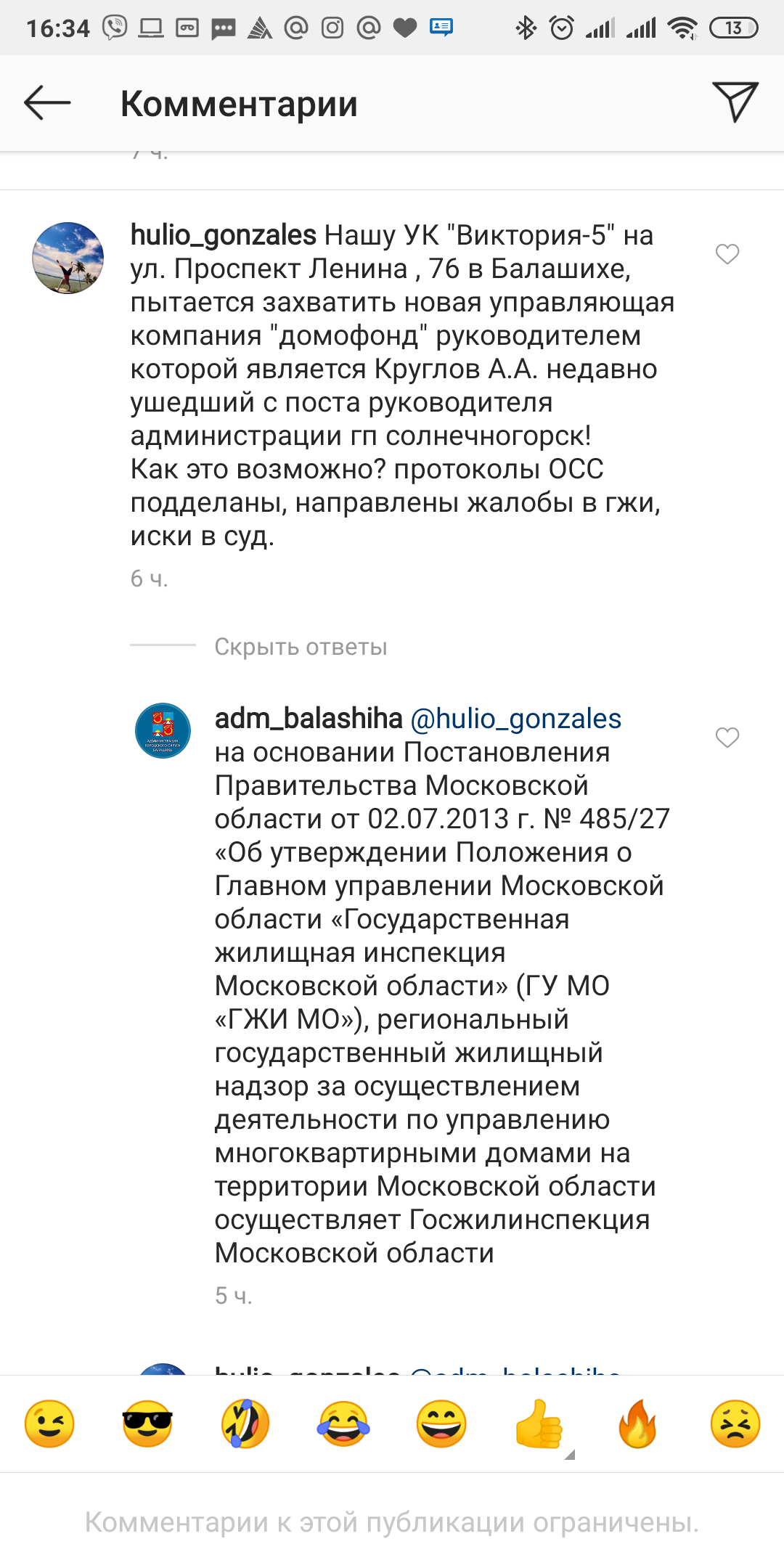 И администрация го Балашиха зачем-то продолжает выискивать обращения собственников и повторять свой шаблонный ответ. Вот, например, комментарий под одним из постов в Инстаграме губернатора Московской области Воробьева Андрея Юрьевича. Реакция администрации го Балашиха не заставляет себя долго ждать