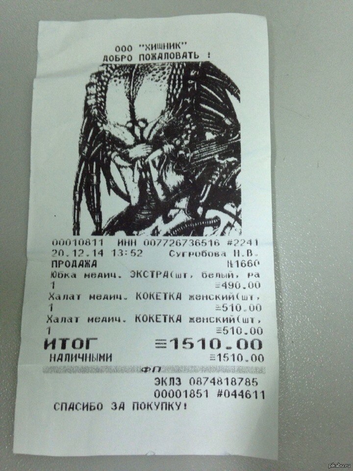 14 MellisaNight ООО "Хищник" - мы Вам рады! 10 лет назад Еще никогда покупка медицинской спецодежды не была такой опасной... [моё] Чужой против Хищника Веселые чеки Чек Одежда Магазин Покупка Хищник (фильм)