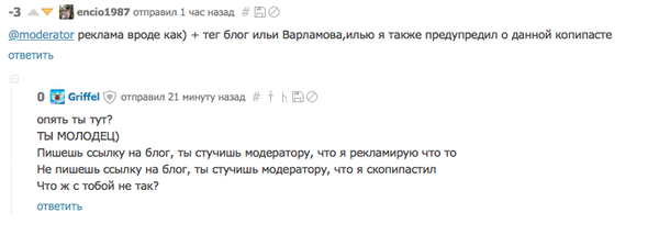 В другом месте, он яро призывал модератора из за того, что я не указал источник: