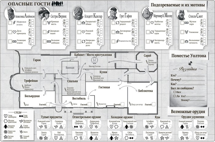 Нет никаких сомнений в том, что «Опасные гости» — это сокровище, хотя самая первая наша партия была весьма неловкой. Стиль предоставления улик и доказательств требует некоторого обучения. Почти все карточки в игре дают чёткую подсказку о том, как отметить детали полученной информации на листе Отслеживания, но случались и такие моменты, когда мои игроки не были уверены, что делать с конкретными доказательствами, которые предоставляли карты Улик без вышеописанных указаний. ( Например, «Клодетт утверждает, что она была с Мортимером во время убийства». Для себя я решила проблему с помощью цветных карандашей - обозначив каждого персонажа цветом. Каждая пометка соответствующего цвета подсказывала мне, с чьих именно слов была зафиксирована конкретная информация).