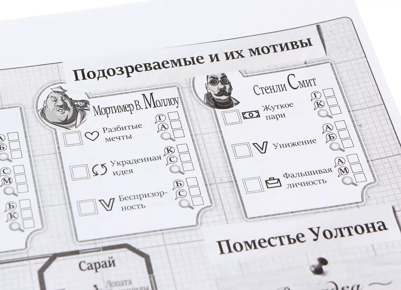 Примечание**: для игры каждому игроку потребуется карандаш (в комплектацию они не входят). Для полного удобства отслеживания взаимосвязей подозреваемых можно использовать цветные карандаши (в комплекте 6-7 цветов на игрока).