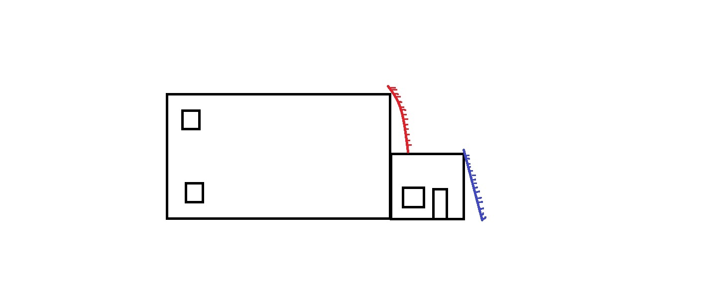 Прошлым летом я снимал с крыши здания прожекторы. Это здание было двухэтажное и сначала надо было подняться по составной лестнице (синяя) на одну крышу и потом подниматься на вторую крышу по пожарной лестнице (красная). Составную лестницу надо было поднимать на крышу, потому что её могли украсть, пока бы я возился с прожекторами (район не очень).