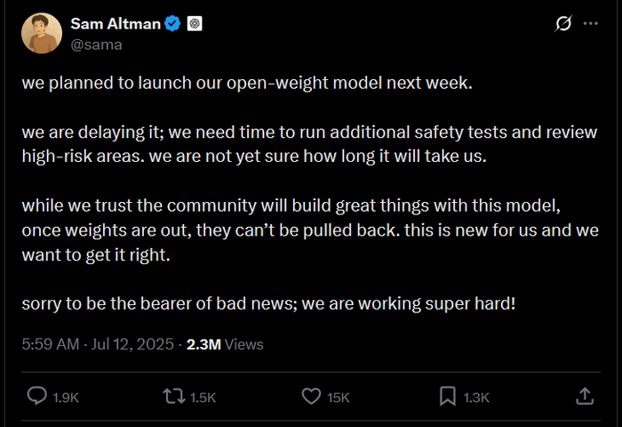 Альтман: "Мы планировали запустить нашу модель с открытыми весами на следующей неделе.