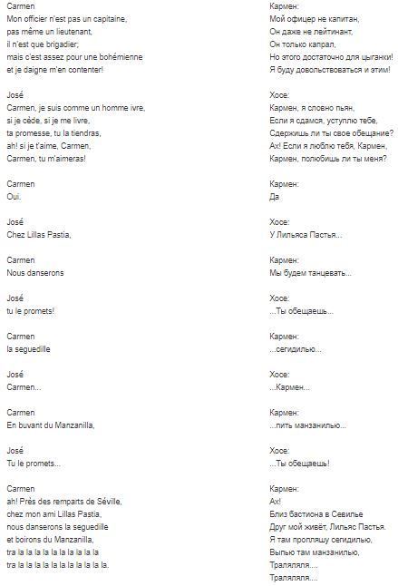 Не успевают они закончить свой дуэт, как на фабрике слышится ужасный шум, и работницы выбегают на улицу. Капитан Цунига, пытаясь навести порядок, выясняет, что причина паники Кармен: она набросилась на одну из девушек и полоснула ее ножом. Он приказывает дону Хозе арестовать виновницу, привести ее к нему на разбирательство в казарму и сторожить ее, пока он не решит, что с ней делать, оставшись одна с доном Хозе, Кармен окончательно завоевывает сердце молодого солдата пьянящей сегидильей («Pres de la porte de Seville» — «Близ бастиона в Севилье»). В ней она обещает петь и танцевать для него — и любить его! — в одном кабачке близ Севильи (не слишком хорошей репутации), который держит ее приятель Лильяс Пастья. Текст в комментах.