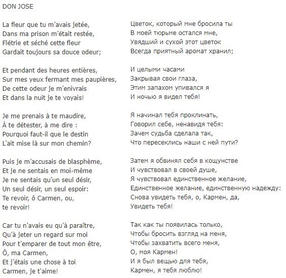 Кармен, ожидающая Хозе, выпроваживает всех из кабака и тепло приветствует дона Хозе, пришедшего сюда после своего освобождения из-под ареста. Как она и обещала, она поет и танцует для него. В разгар ее танца слышится звук трубы, который для дона Хозе является сигналом явиться в казарму. Он хочет идти, но это еще больше распаляет Кармен. «Так ты обращаешься с девушкой?» — кричит она ему. Кармен в гневе: она не желает больше видеть мужчину, для которого есть что-то более важное, чем ее любовь. Задетый ее упреками, он вынимает цветок, который она бросила ему когда-то, и в очень страстной «арии о цветке» рассказывает о том, как он вдохновлял его все те дни, что он провел в тюрьме («La fleur que tu m’avais jetee» — «Видишь, как свято сохраняю цветок, что ты мне подарила»). Текст в комментах.