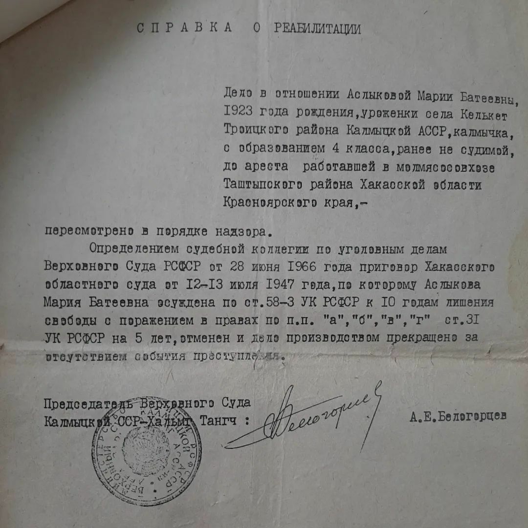 Несмотря на то, что основная часть жителей не была пособниками фашистов, депортация коснулась каждого. 28 декабря 1943г постановление № 1432/425сс "О выселении калмыков...". В ближайшие дни 46ю эшелонами было вывезено в Сибирь 93139 человек., ещё несколько тысяч - в 1944г. Жертвами депортации считаются более 1/3 калмыцкого народа. Реабилитированы спецпереселенцы были только в 1956г.