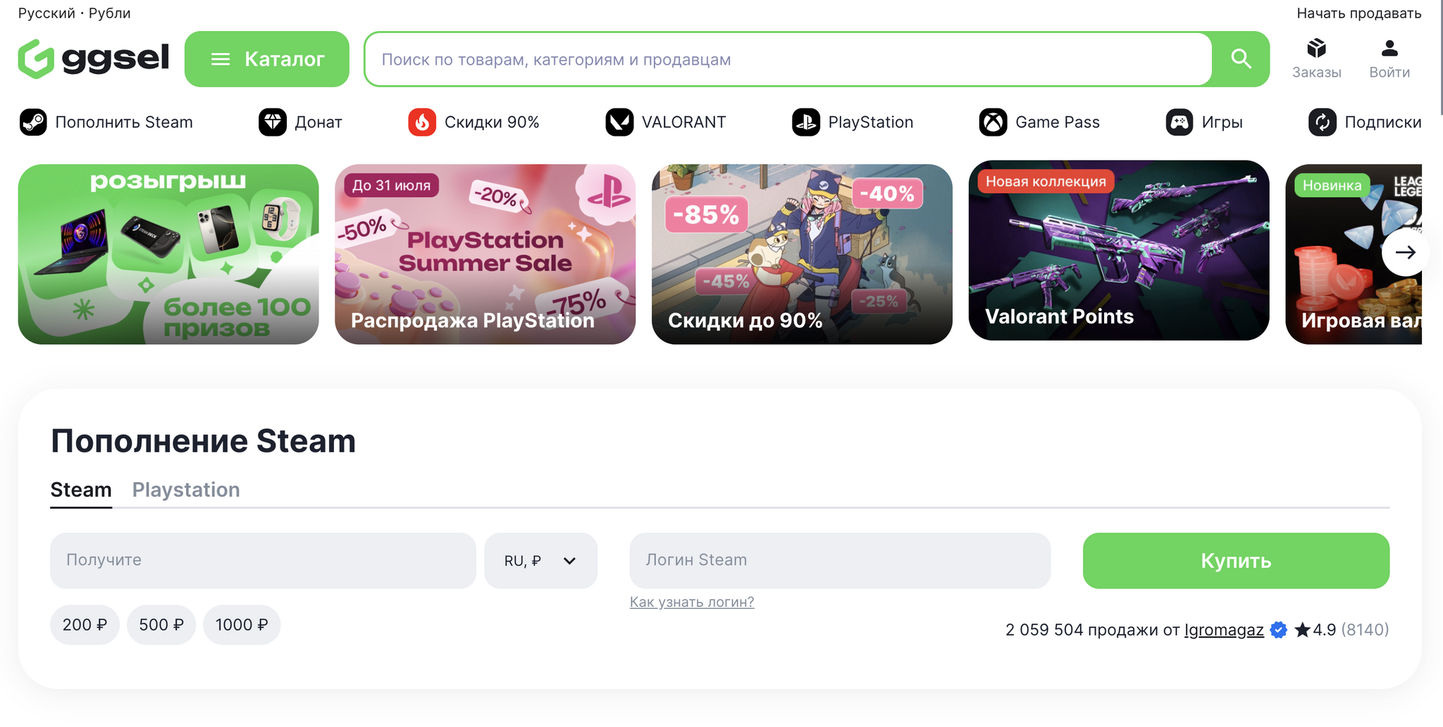 GGSEL — это маркетплейс, где можно найти множество вариантов, как оплатить покупку в Стим. Здесь доступна покупка кодов пополнения, подарочных игр и даже готовых аккаунтов. Инструкция: