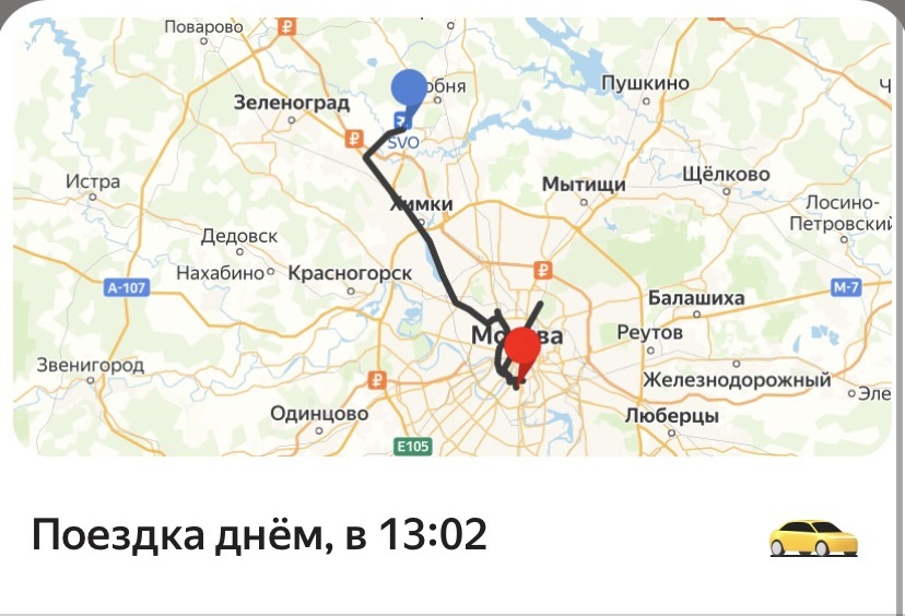 Заказала такси в приложении Янд. Го класса эконом в аэропорт Шереметьево. При предоставленном выборе маршрута по бесплатной дороге за 1 час 06 минут и по платной дороге за 1 час 05 минут, выбрала по бесплатной. Такси приехало за 4 минуты, я стояла ждала у дороги, выехали в 13:02. Прикинула, что в 14:15 буду в аэропорту. (Скрины приложения не делала, так как не ожидала, что опоздаю, время в запасе было).