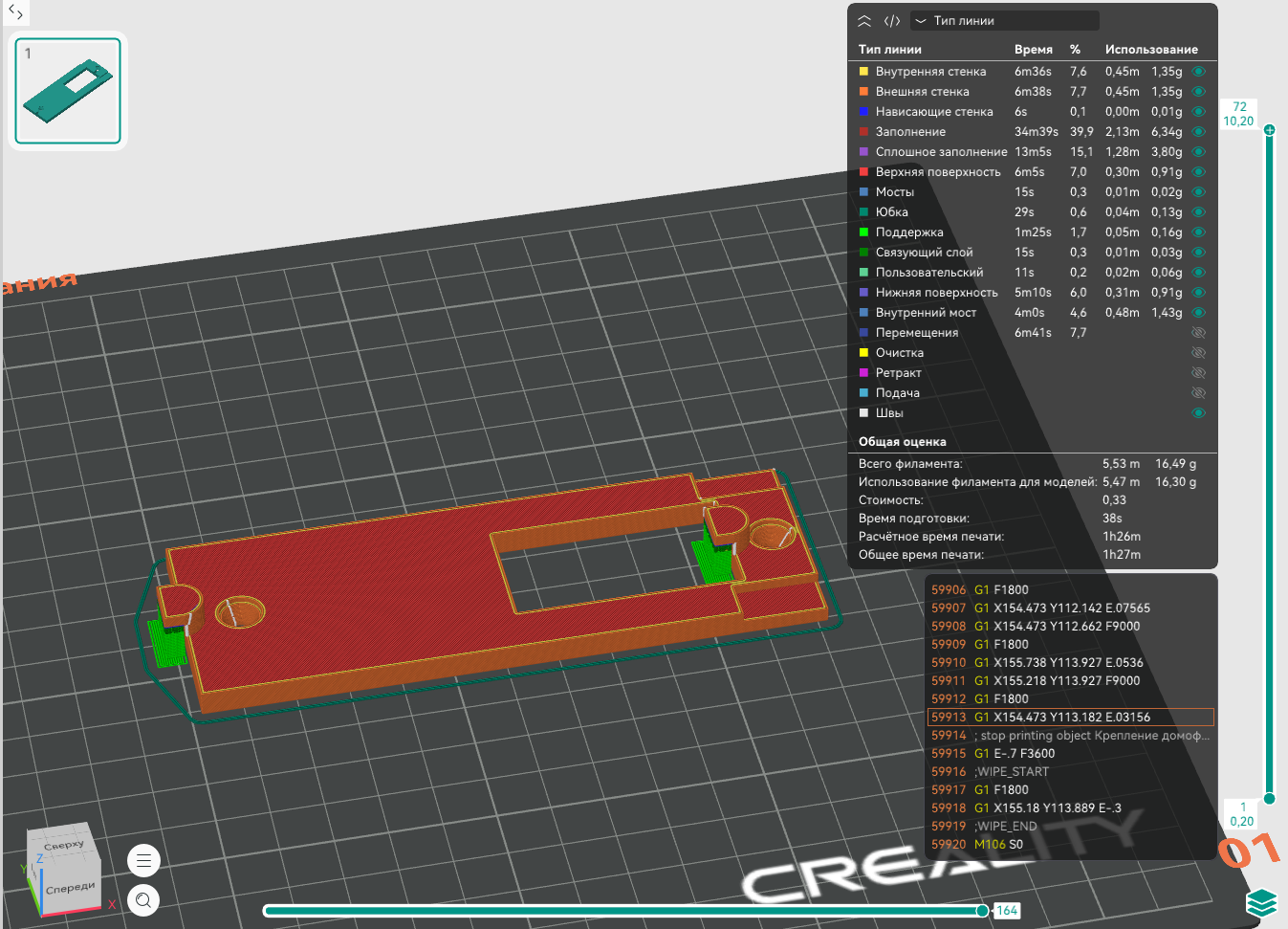 Сверяемся с размерами и отправляем модель в слайсер. По рассчетам, будет потрачено 16 грамм пластика.