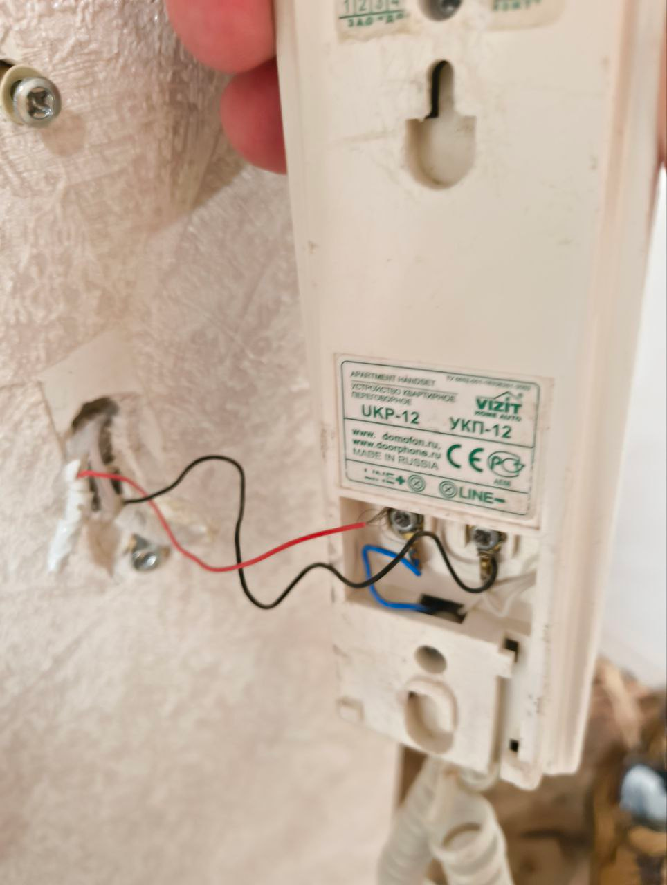 На съёмной квартире установлена трубка домофона УКП-12. Закреплена она была на два вываливающихся самореза, то есть даже дюбелей не было. Тот, что вы видите на фото, устанавливал уже я, но это ситуацию не спасло. Ушки корпуса трубки больше по размеру, чем шляпка самореза, из-за чего трубка болталась и её можно было случайно снять со стены.
