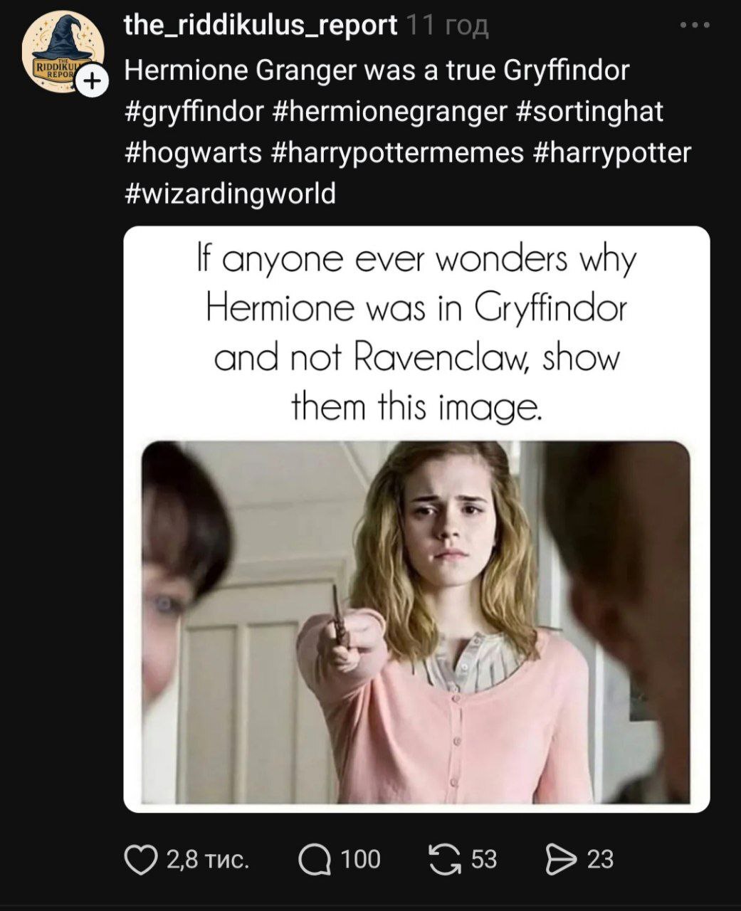 Перевод: "Если кто-то будет удивляться, почему Гермиона была в Гриффиндоре, а не в Рейвенкло, покажите им эту картинку".