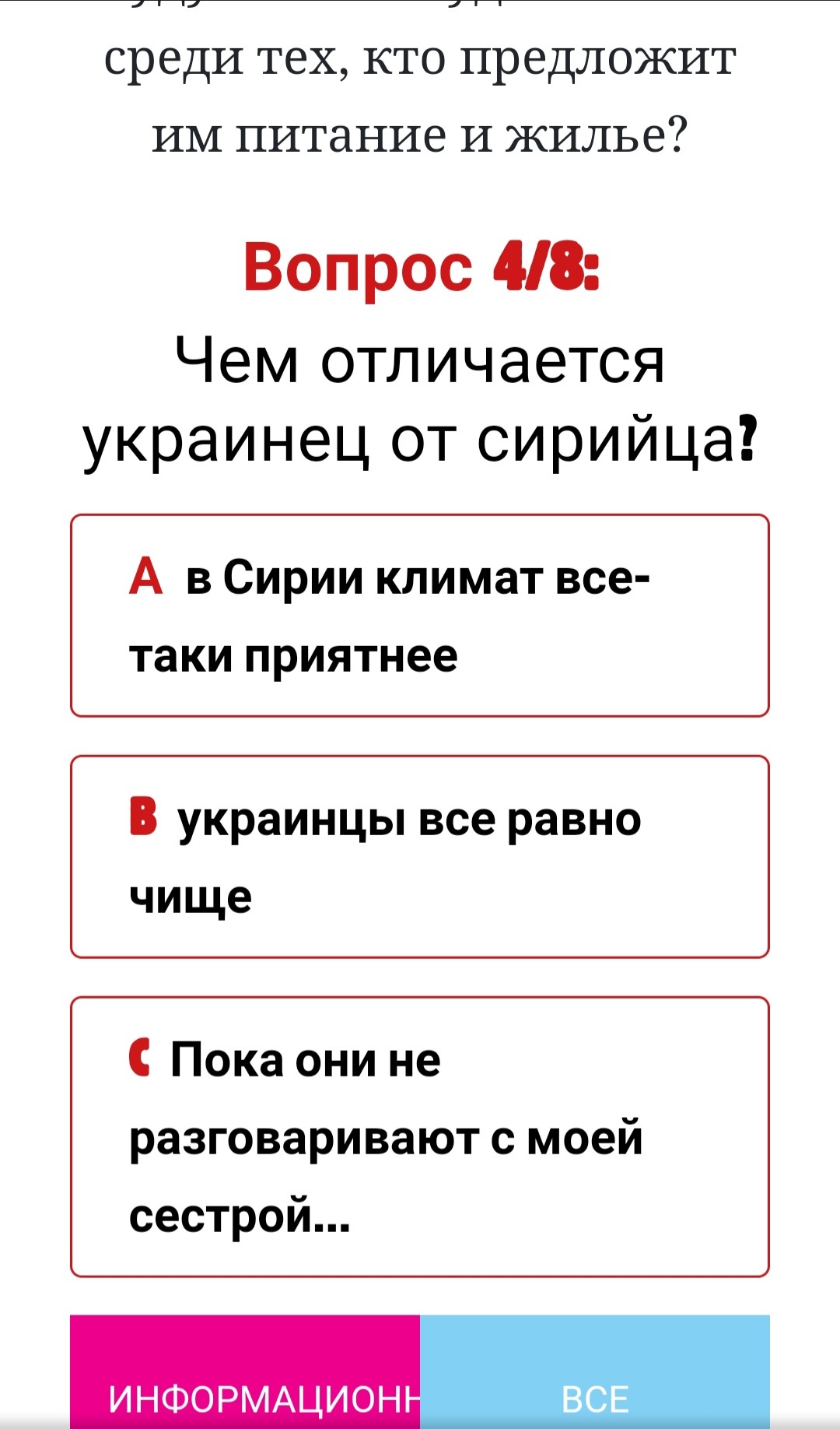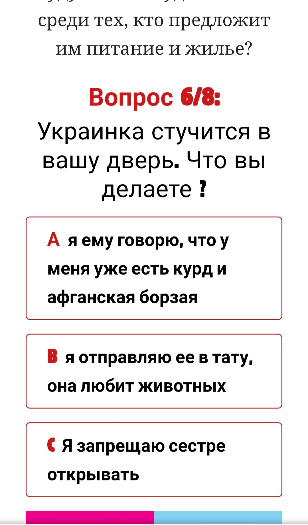 49mm 3 года назад Опрос в Charlie Hebdo https://charliehebdo.fr/jeux/quiz/etes-vous-pret-a-accueilli... Политика Украина Charlie Hebdo Длиннопост Ещё 0