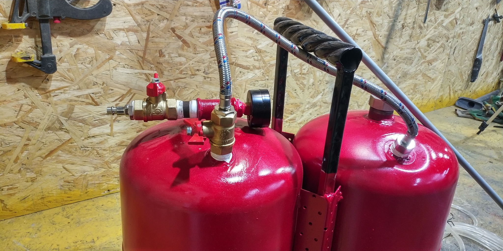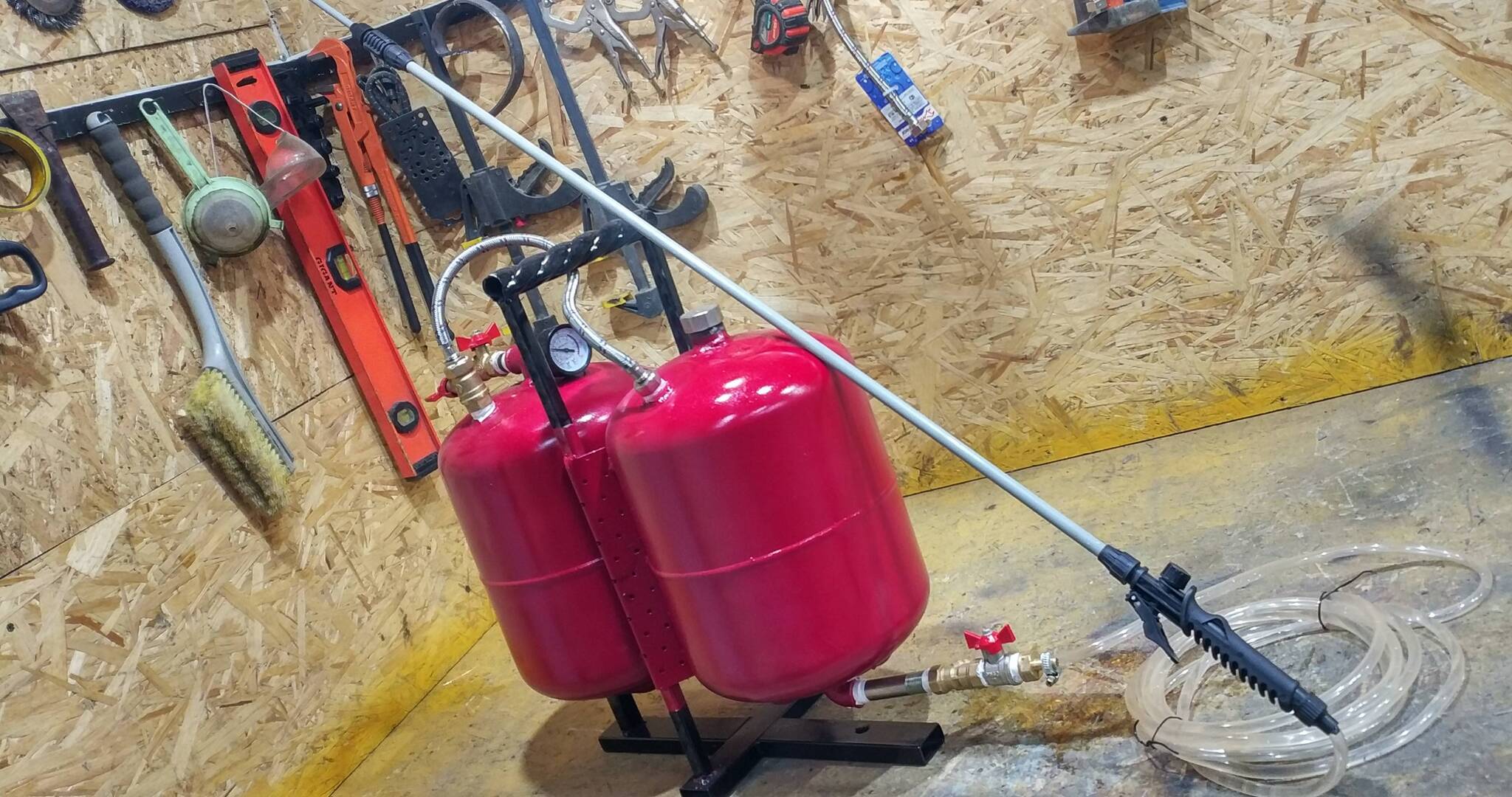 Конструкция простая. В первый баллон через быстросъем накачивается воздух до 5-6 очков за несколько секунд. Потом заливается отрава. Потом открыаем второй вентиль, чтобы воздух создал давление во втором баллоне. И затем уже внизу открываем подачу на брандспойт.